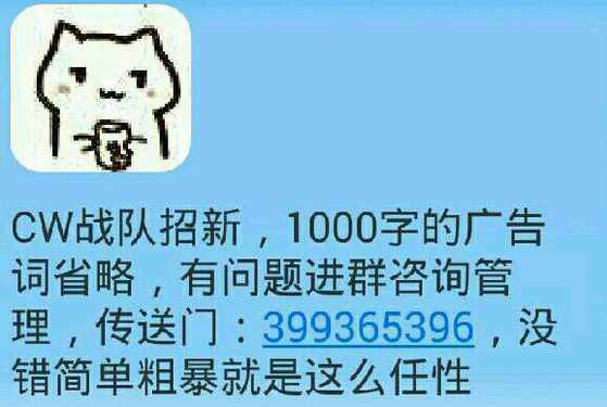 CWS战队招新。我们是五人开创的战队,以五人之力血战群雄,得以入盟。如今我们处于发展初期,虽然人数增加不少,但仍急需大量同道玩家加盟,无论娱乐竞技,我们都能让你提高变强。入队友谊积分制,积分高者当管理,欢迎大佬跳槽,新人来学习。群:621910721